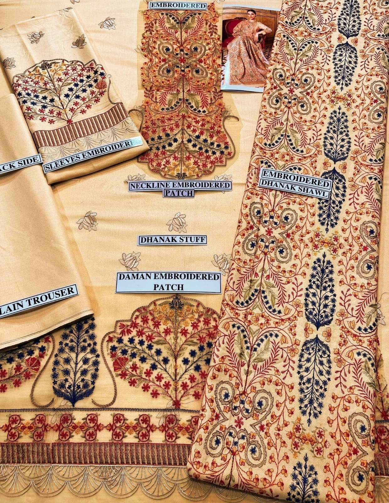 Embroidered dhanak front with daman and neck patch