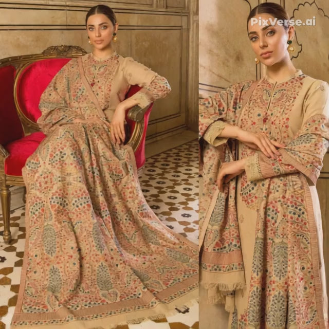 Embraided Dhanak 3 Piece Suit With Wool Shawl